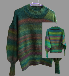 Top-down, completely seamless, diagonal shoulders with balloon sleeves, and sizes 10 to 15 cm looser.