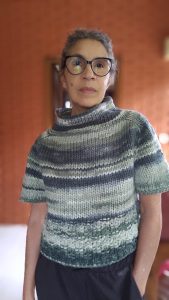 Knitted vest worked from the top down and completely seamless. Featuring short sleeves and a high collar, the shoulder shaping is inspired by the Contiguous Sleeve method, developed by Susie Myers (SusieM on Ravelry).