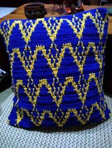 A almofada é trabalhada na técnica do fio conduzido, também conhecida como tapestry crochet. Os pontos utilizados são somente o ponto alto e o ponto corrente. O gráfico é lido da direita para a esquerda em todas as linhas.
