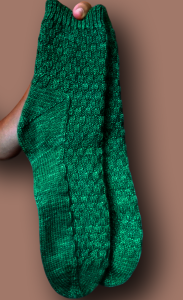 O diferencial fica por conta do calcanhar que é feito utilizando a técnica Fleegle Heel, que simplifica as voltas curtas eliminando a necessidade de levantar pontos, além de não deixar aquele buraquinho nos cantos do calcanhar.